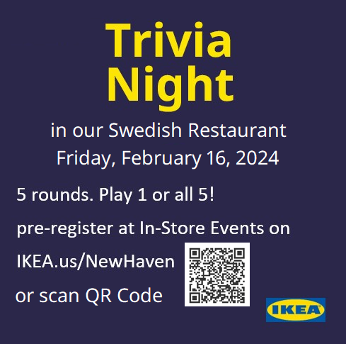 Back to All Events IKEA Trivia Night! Friday, February 16, 2024 6:00 PM 7:00 PM Ikea 450 Sargent Drive New Haven, CT, 06511 United States (map) Google Calendar ICS