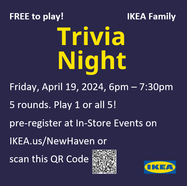 IKEA Trivia Night! Friday, April 19, 2024 6:00 PM 7:00 PM Ikea 450 Sargent Drive New Haven, CT, 06511 United States (map) Google Calendar ICS