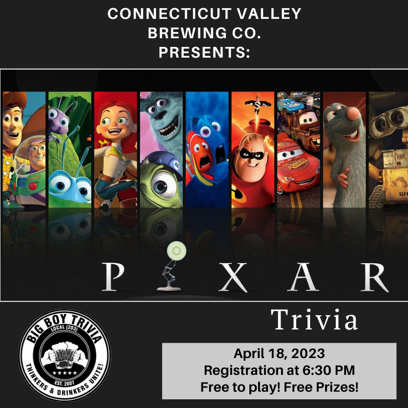 PIXAR Themed Trivia! Thursday, April 18, 2024 6:30 PM 8:30 PM Connecticut Valley Brewing Co. 765 Sullivan Avenue South Windsor, CT, 06074 United States (map) Google Calendar ICS