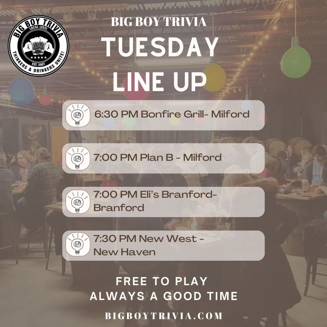Back to All Events Tuesday Night Trivia Tuesday, December 9, 2025 6:30 PM 7:30 PM Google Calendar ICS