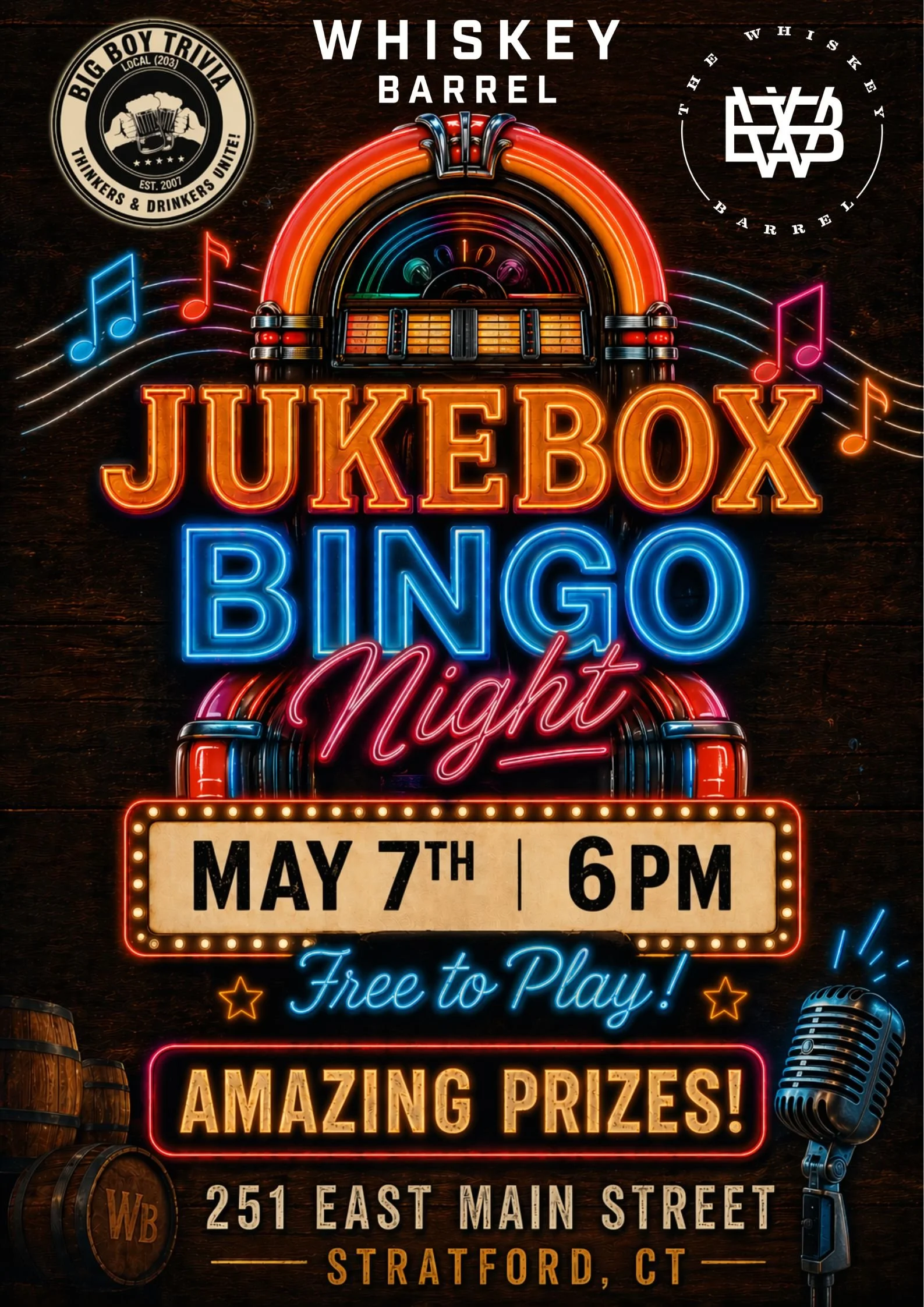 Jukebox Bingo at The Whiskey Barrel Thursday, May 7, 2026 6:00 PM 8:00 PM Big Boy Trivia & Games West Haven, CT (map) Google Calendar ICS