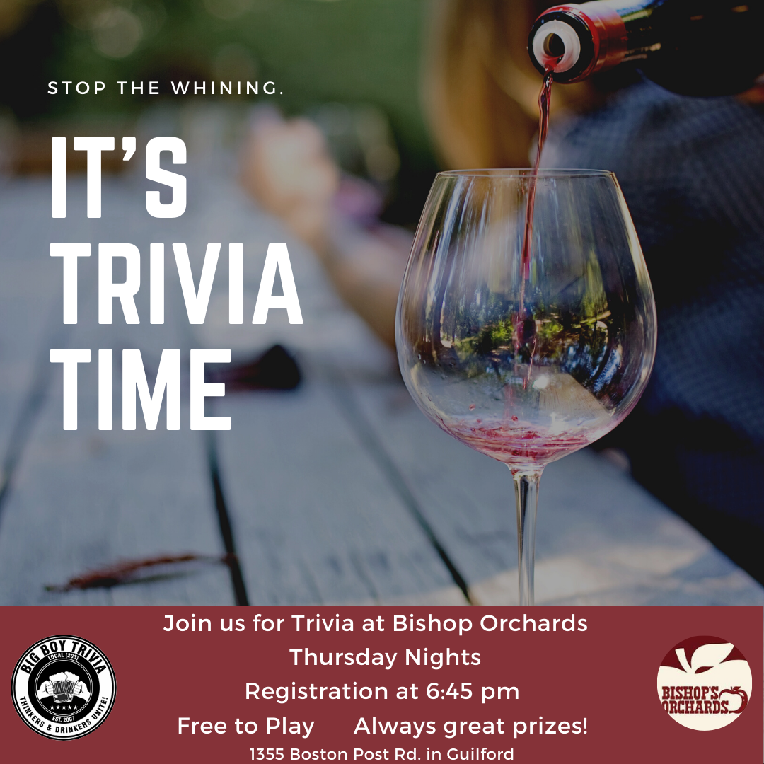Back to All Events Brignole Vineyards Thursday Night Trivia Thursday, September 7, 2023 6:00 PM 7:00 PM Google Calendar ICS