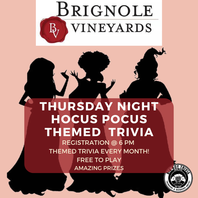 Brignole Vineyards Thursday Night Trivia Thursday, October 5, 2023 6:00 PM 7:00 PM Google Calendar ICS